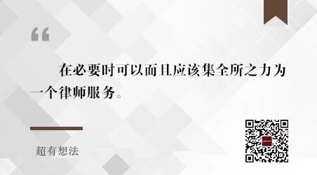 最后,我们一直强调在必要时可以而且应该集全所之力为一个律师服务。这对于小型律所来说可以理解,但对于中型甚至大型律所来说,不太好理解,大多数人认为也无必要。实际上,这是一种理念,也是一种精神,更是一种文化。我们认为,任何一个律师都代表着律所,在某一刻,对于某一个客户,就是律所的全部。所以,在必要时可以而且应该集全所之力为一个律师服务。