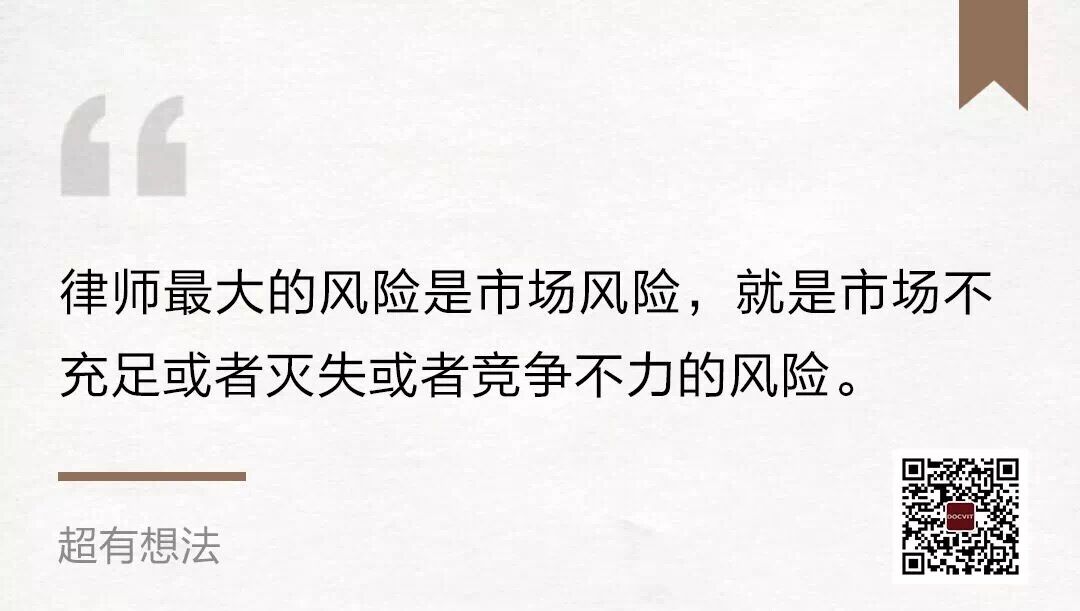 在我看来,律师最大的风险是市场风险,就是市场不充足或者灭失或者竞争不力的风险。特别是在目前市场格局越来越固化,客户选择律师的方式越来越透明,对律师的要求越来越专业的情况下,律师怎么能够获得充足的、有质量的市场,并且保持这种竞争力,是最大的课题。