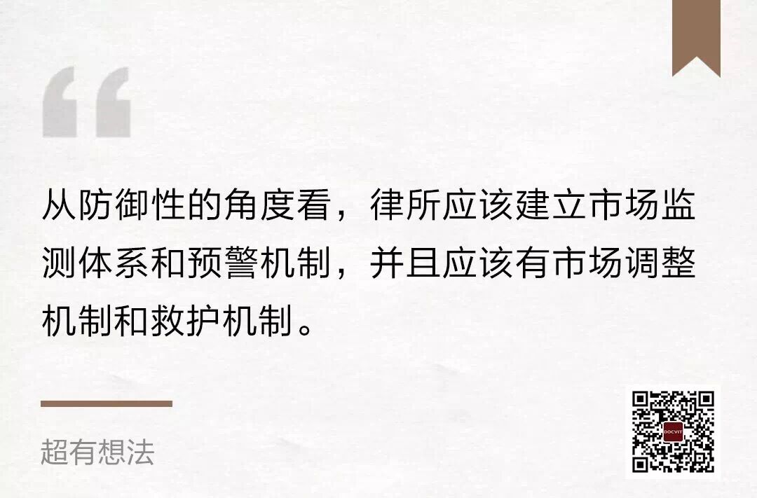 从防御性的角度看,律所应该建立市场监测体系和预警机制,并且应该有市场调整机制和救护机制。譬如,律所应该对市场进行研究,特别针对律所的合伙人主要涉及的业务领域,要有动态把握和规律研究,在律师的市场面临灭失或者竞争力不足的情况下,律所应该组织力量或者搭建平台,帮助律师解决相关问题。道可特在这些方面也在不断尝试和努力,我相信在座的各位同行,也都在做。