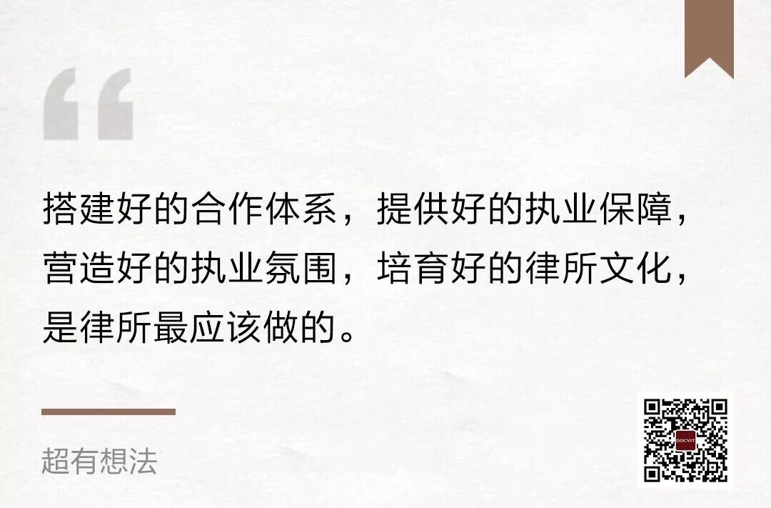一方面,哪些是在这之前可以做的?我想,搭建好的合作体系,提供好的执业保障,营造好的执业氛围,培育好的律所文化,是律所最应该做的。这些看起来都是虚的,但真正能落到实处,那就是对律师的无形保障和有机保护。
