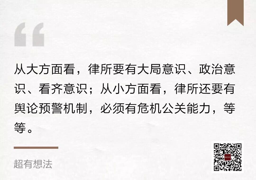 我认为,主要应该有几个方面,譬如,从大的方面讲,律所要有大局意识、政治意识、看齐意识。从小的方面看,律所还要有舆论预警机制,必须有危机公关能力,等等。