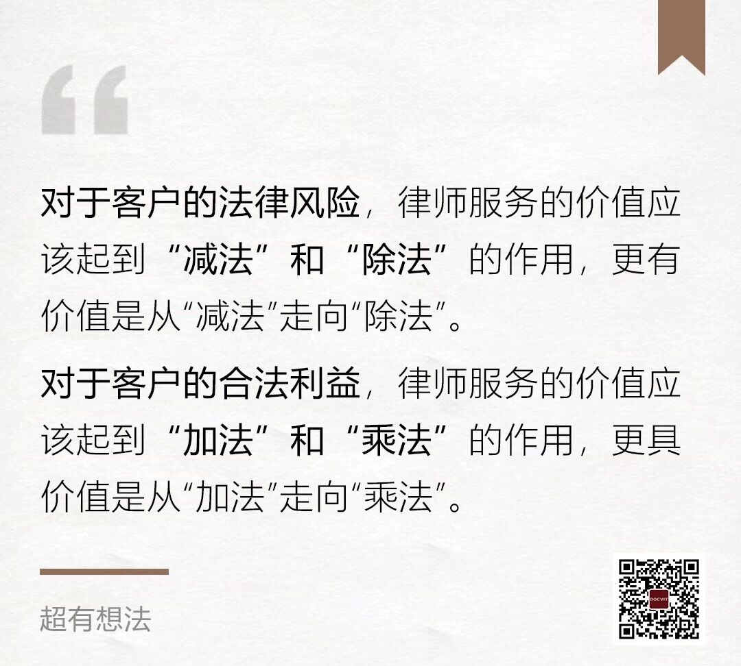 对于客户的法律风险,律师服务的价值应该起到“减法”和“除法”的作用,更有价值就是从“减法”走向“除法”。