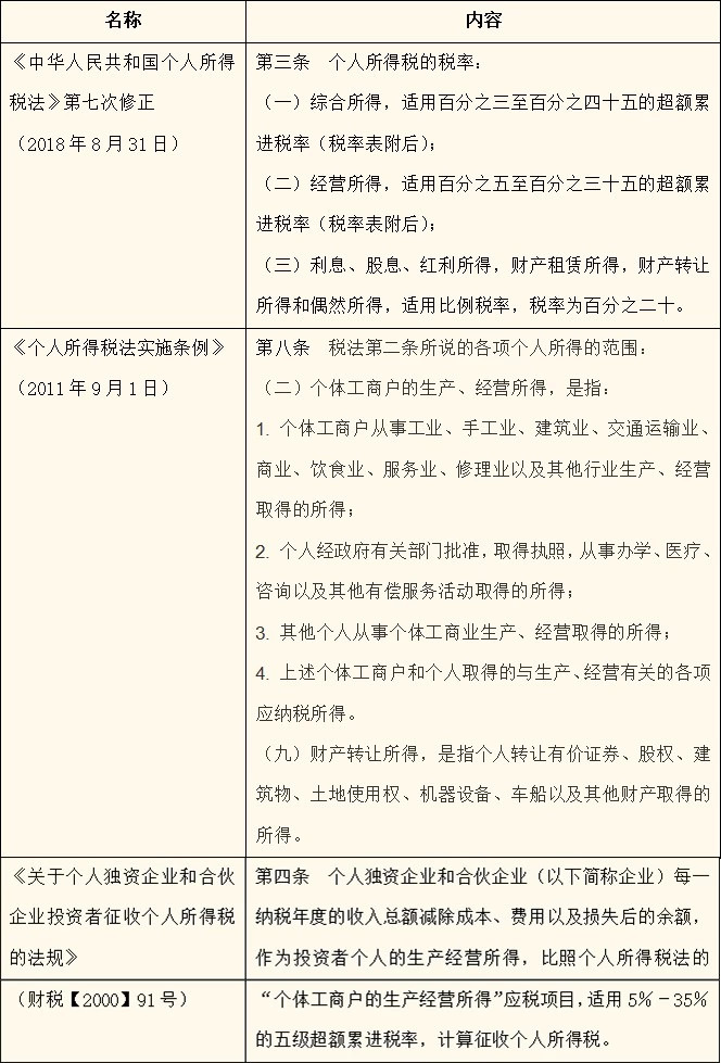 通过上述整理可以看出,《个人所得税法》规定了合伙企业中自然人所得税中经营所得、财产转让所得等的税率;《个人所得税法实施条例》规定了个体工商户生产经营所得、财产转让所得的具体范围;《关于个人独资企业和合伙企业投资者征收个人所得税的法规》规定了合伙企业收入减去成本等费用后,作为投资人个人经营所得比照个体工商户的生产经营所得纳税。