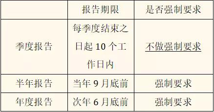 注:根据《信息披露管理办法》的规定,私募基金年度报告应当于次年4个月内披露,表中显示的报送期限为次年6月30日,故在本表格统一采取信披平台中的报送期限,以便私募基金管理人适用。