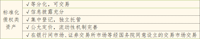 资管新规规定,标准化债权类资产之外的债权类资产均为非标准化债权类资产,而标准化债权类资产应当同时符合的条件包括以下五项: