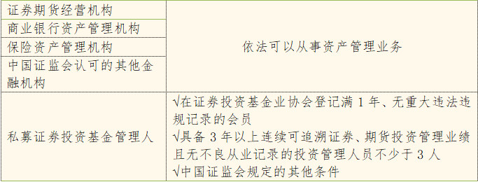 其中,商业银行资产管理机构、保险资产管理机构以及中国证监会认可的其他金融机构为新增加的主体,对比《商业银行理财业务监督管理办法》和《商业银行理财子公司管理办法(征求意见稿)》(银行理财子公司可以选择符合条件的私募投资基金管理人担任理财投资合作机构),各类金融机构平等准入的政策导向逐渐明确。
