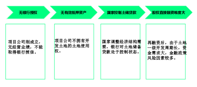 承包人先利用股权投资,成立项目公司,股权投资不能满足土地一级开发的需要,然后以项目公司为主体进行再融资。项目公司成立之初由于存在以下原因,导致再融资困难,项目公司面临资金链断裂的风险: