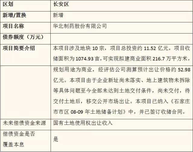 继北京市政府发行土地储备专项债之后,福建省、河北省也相继在中国债券信息网上发布了发行2017年土地储备专项债券的相关文件,其中包含土地储备专项债对应的项目相关情况。下表是2017年河北省石家庄市土地储备专项债券(一期)对应的其中一个项目信息披露情况: